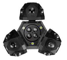 Cabeza móvil con 3 cabezas que incluyen láser, luz estroboscópica, wash y gobo. Ideal para crear efectos complejos y dinámicos en un solo dispositivo.