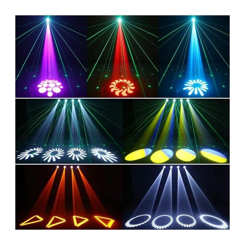 Un dispositivo 3 en 1 que combina una cabeza móvil tipo spot, láser y luz de rayas. Perfecta para crear efectos visuales intensos y dinámicos durante espectáculos y eventos en vivo.