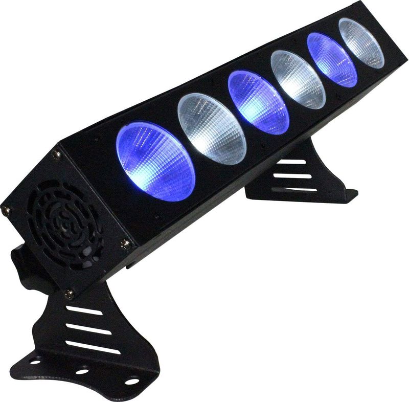 Cabezas móviles mini COB (Chip on Board) de 25W con LEDs RGBAW (rojo, verde, azul, ámbar, blanco) para una amplia gama de colores. Esta unidad tiene un motor de 32 bits para una mayor precisión en los efectos y una transición de colores más suave.
