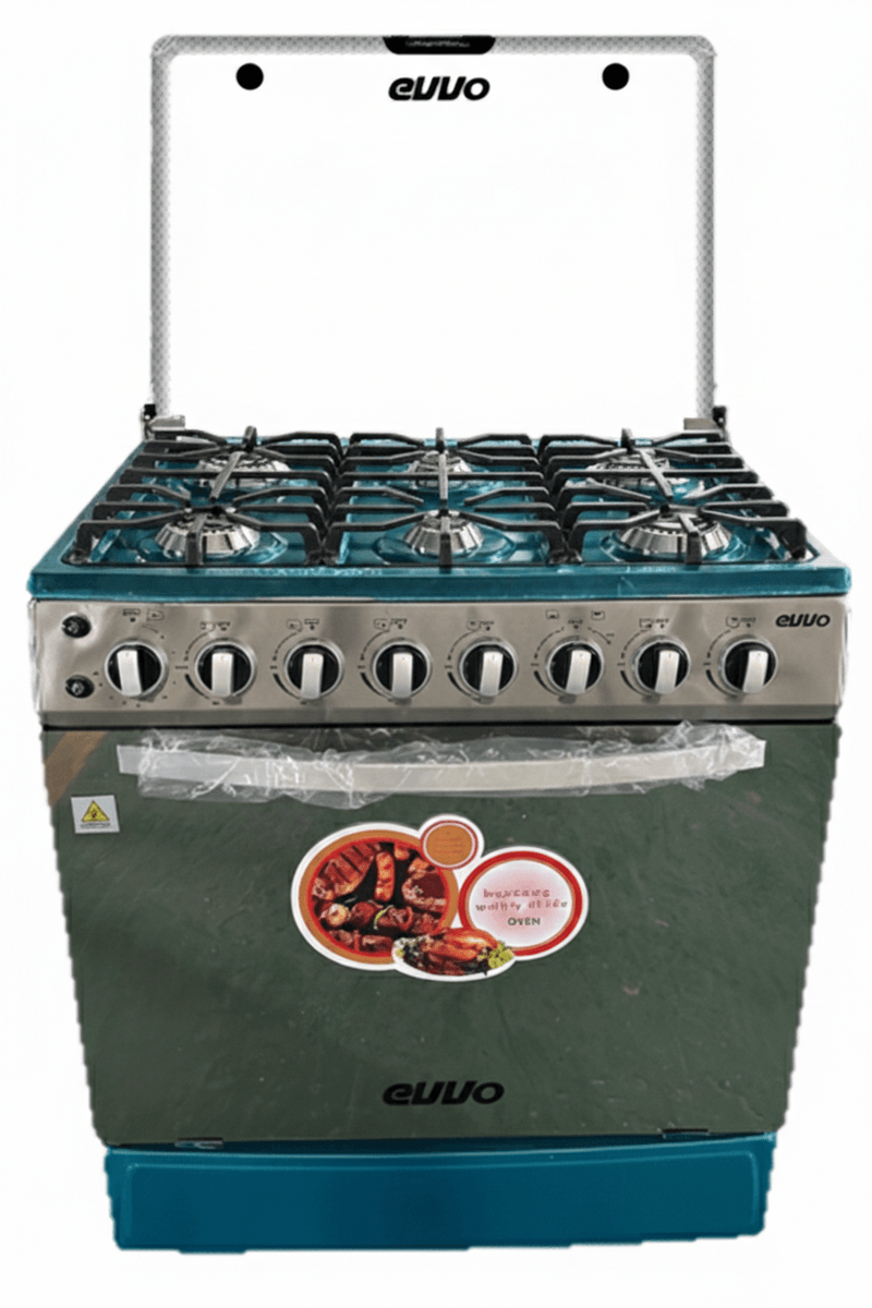COCINA EVVO 6 QUEMADORES A GAS CON HORNO EV-Q06W, 120 LITROS DE CAPACIDAD Y TIMER