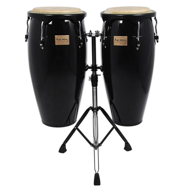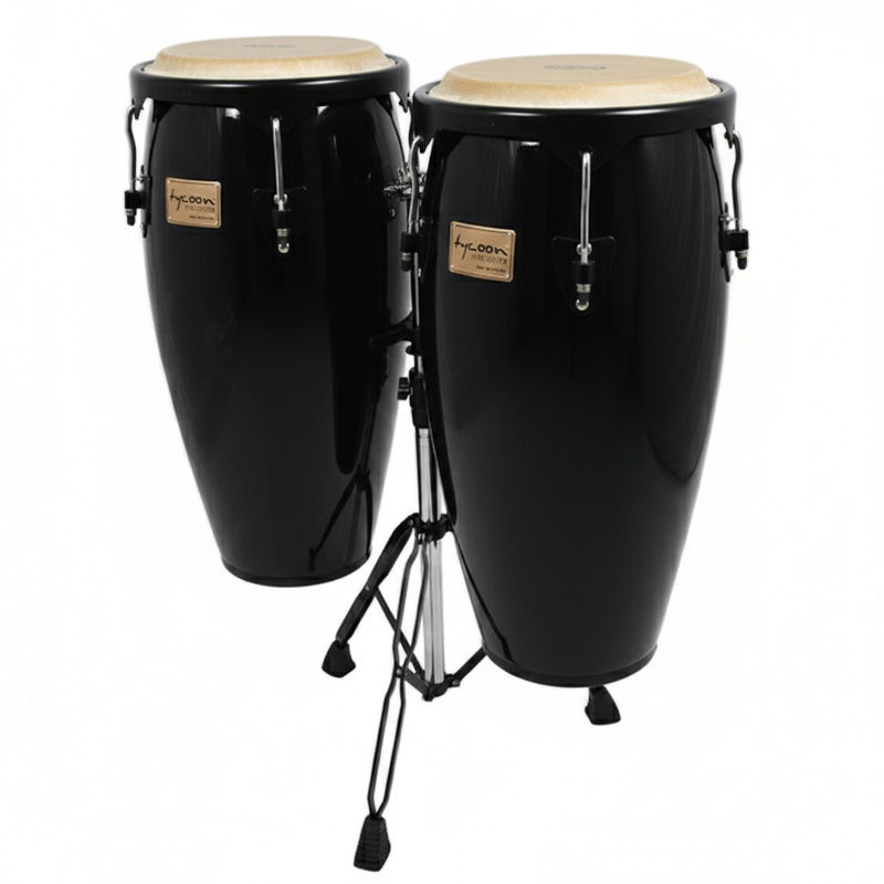 Conga Tycoon STC‑1B BK/D: 10″+11″, 28″ alto, madera Siam Oak con acabado negro pulido, herrajes negros, parches piel búfalo, incluye soporte y llave