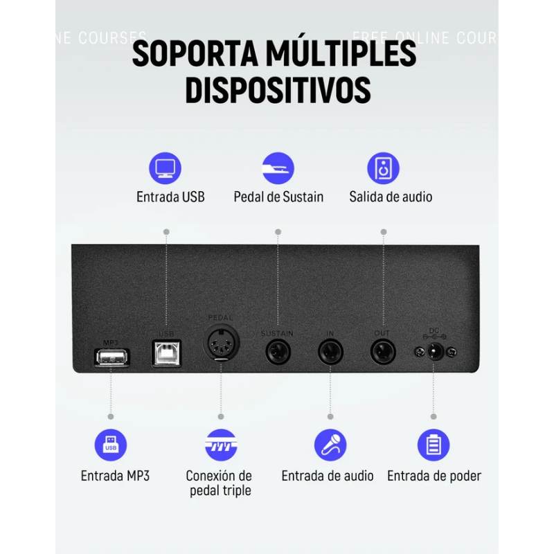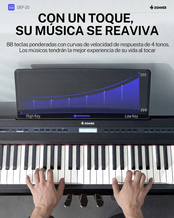 INSTRUMENTOS MUSICALESTECLADOS, PIANOS Y SINTETIZADORESPIANOSPIANO DONNER DE 88 TECLAS CON SOPORTE DEP-20